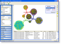 Results are shown in a Cluster Map. The map shows you how information is related to your search terms. In the example at the right three search terms are used. The map shows documents as yellow nodes, web pages as green nodes and e-mails as blue nodes. Click on the map to view it at its normal size.